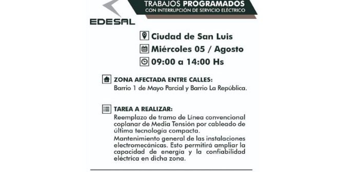 La empresa distribuidora de energía en la Provincia Edesal SA informó que este miércoles entre las 9:00 y las 14:00 interrumpirán el servicio en los barrios 1° de Mayo y La República de la ciudad de San Luis para realizar obras de infraestructura.
