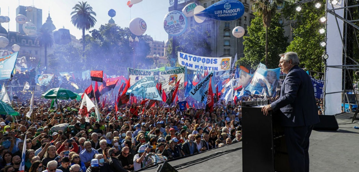 El jefe de Estado habló ante una Plaza de Mayo ocupada por militantes que se dieron cita desde las 15 frente a Casa de Gobierno convocados por el Frente de Todos, que estuvo allí representado en todas sus vertientes.