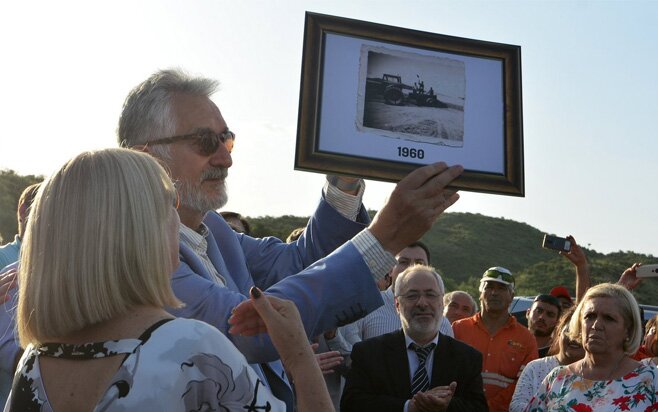 Tras descubrir el cartel de obra que indica la realización de otro sueño puntano, como el camino de circunvalación del dique Cruz de Piedra, en representación de dos generaciones que vivieron la historia de más de sesenta años de este emblemático espejo de agua, la señora Leonza Gómez, viuda del participante ganador del concurso fotográfico “Postales del dique Cruz de Piedra”, hizo entrega al gobernador de una de las fotos históricas que integraron la muestra itinerante.