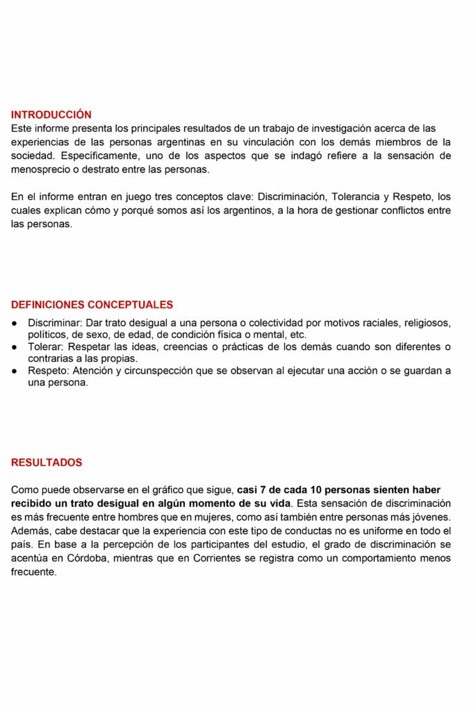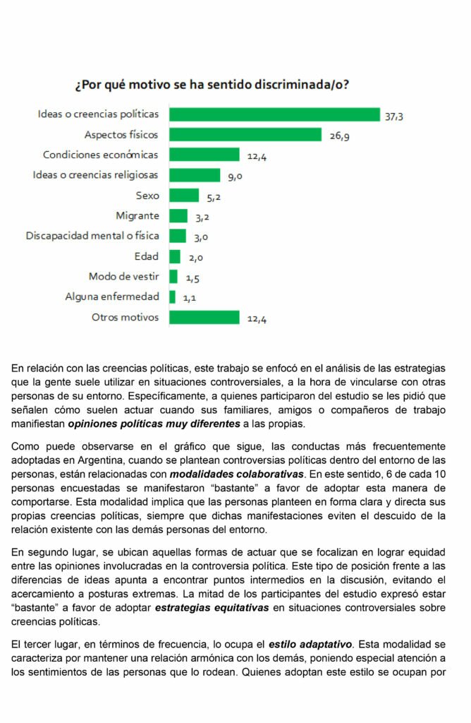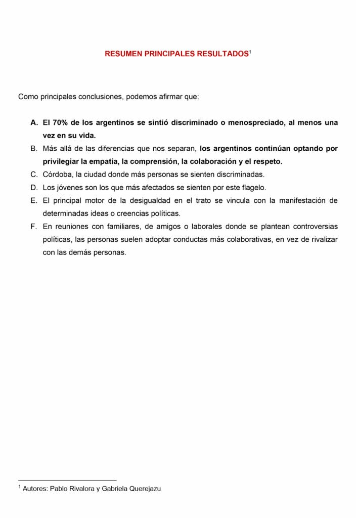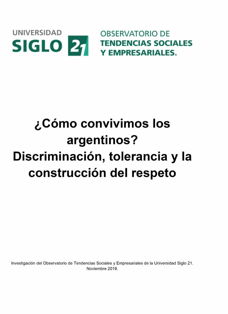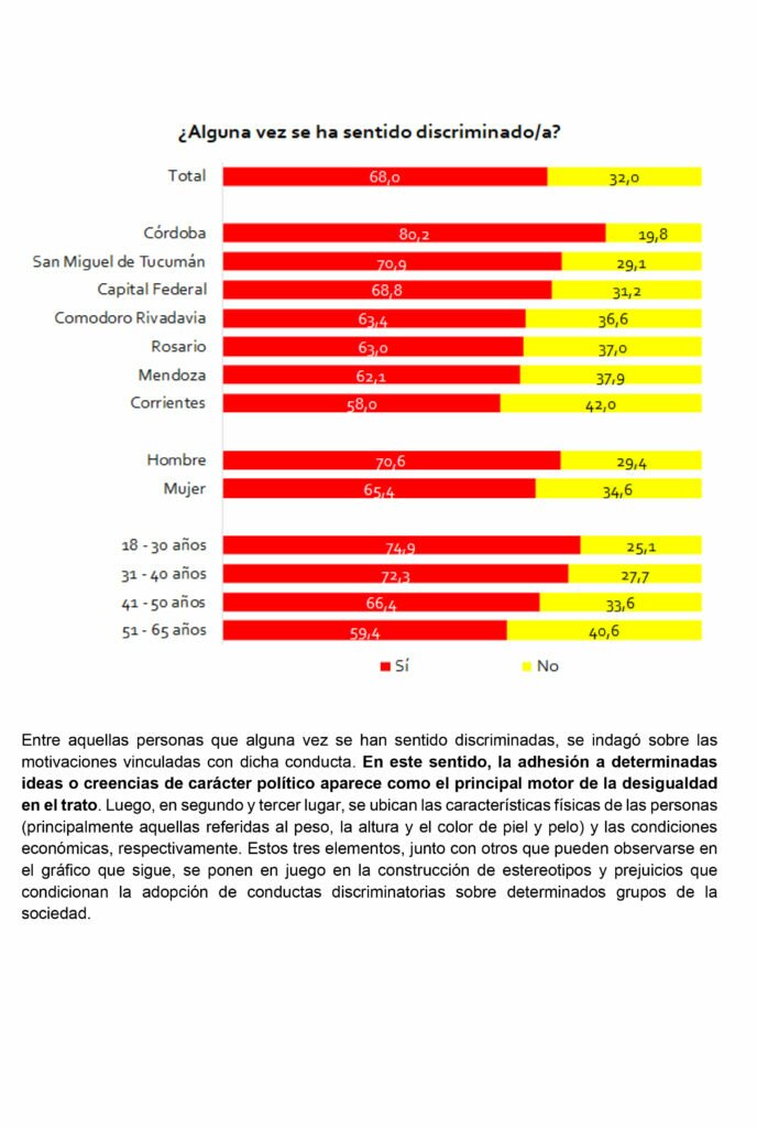 La investigación indaga sobre los cánones de convivencia, respeto y tolerancia de los argentinos. Los resultados muestran que la problemática de la discriminación es frecuente y está presente en todo el país, donde el 70% de los argentinos se siente menospreciado o discriminado.