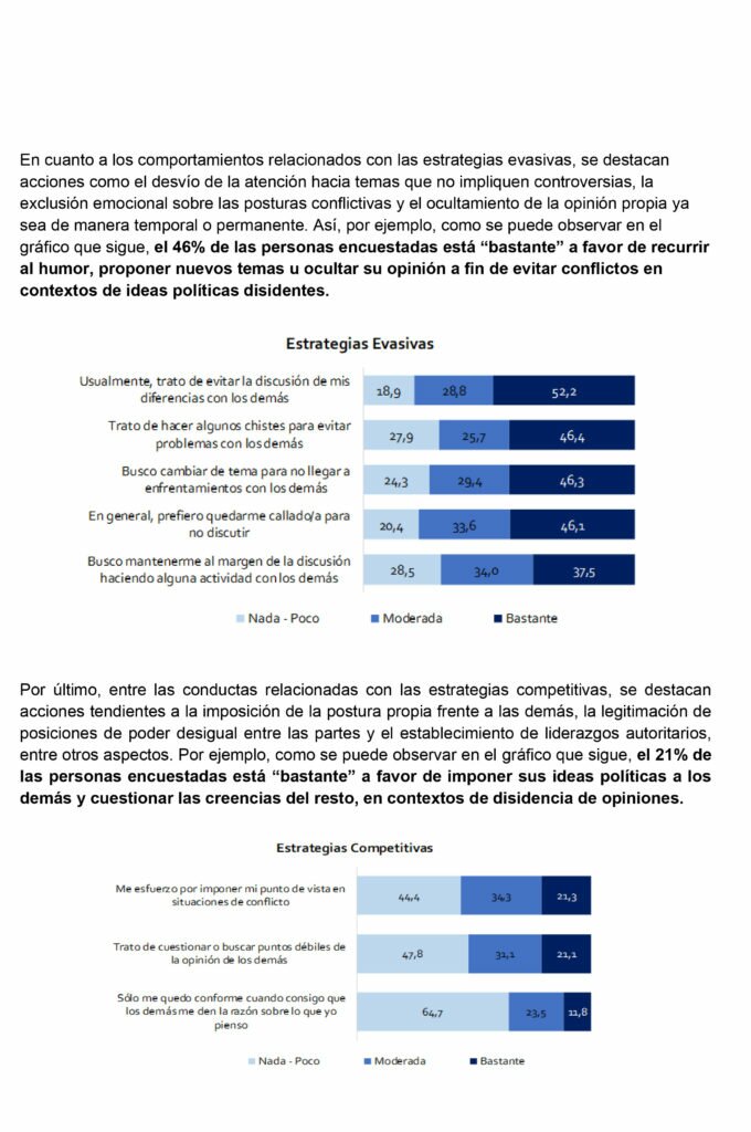 Finalmente, por el contrario, sólo 2 de cada 10 encuestados expresó estar a favor de rivalizar con las demás personas, simplemente por el hecho de pensar diferente, tratando de imponer sus ideas políticas a los demás y cuestionar las creencias del resto.