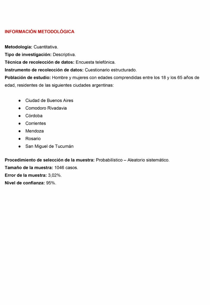 El marco muestral contempla encuestas a hombres y mujeres con edades comprendidas entre los 18 y los 65 años, residentes de 7 ciudades argentinas: Buenos Aires, Comodoro Rivadavia, Córdoba, Corrientes, Mendoza, Rosario y Tucumán.
