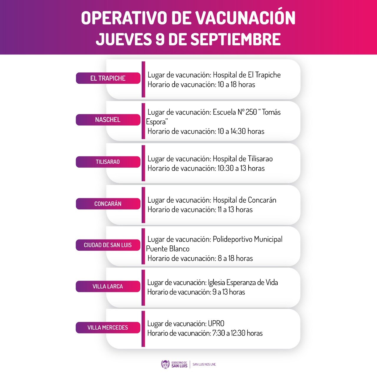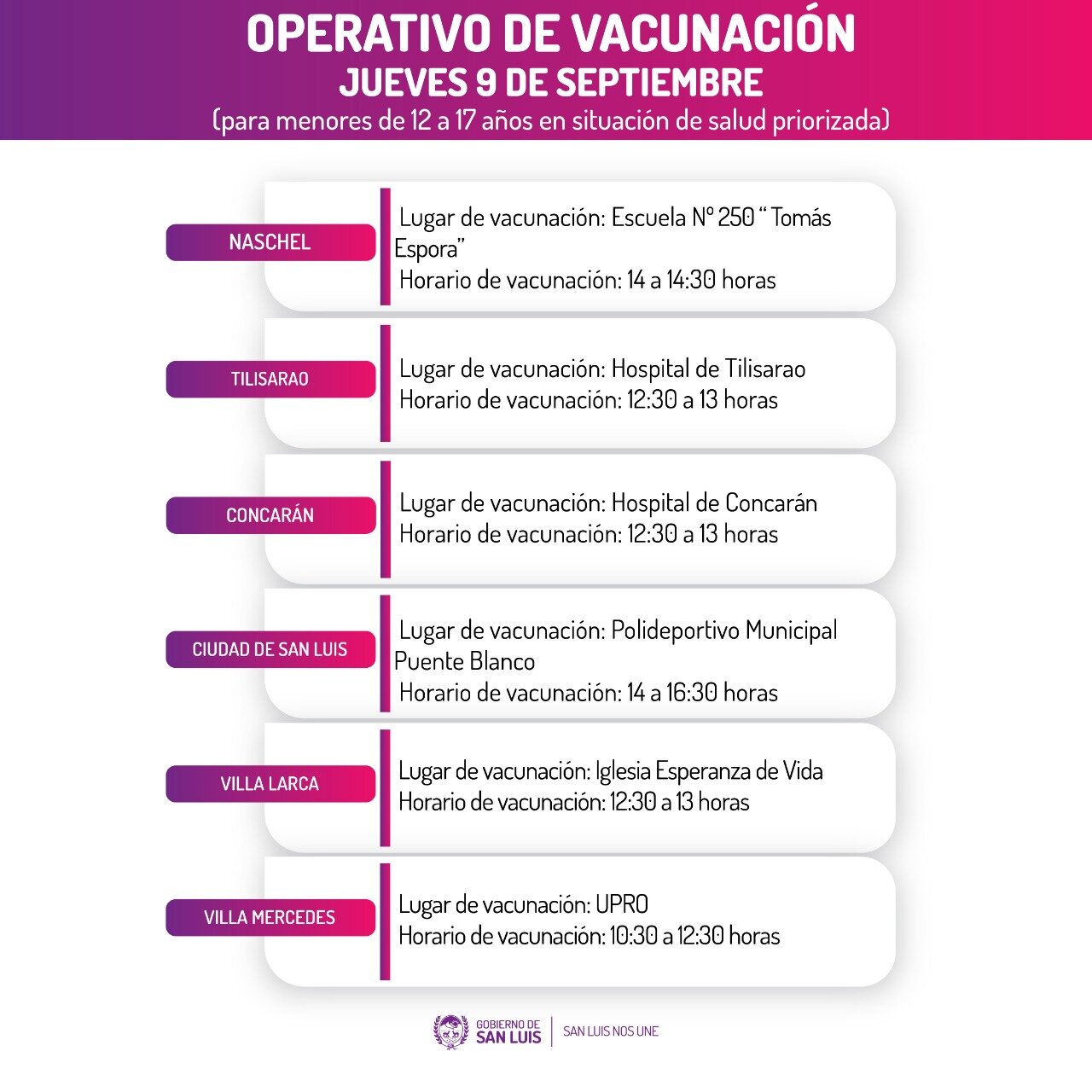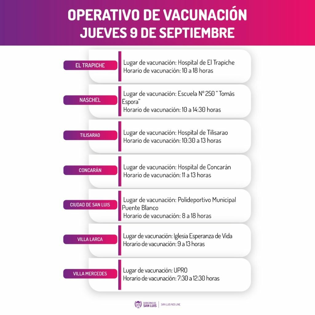 “El operativo se desarrollará en El Trapiche, Villa Mercedes, San Luis, Naschel, Tilisarao, Concarán y Villa Larca. En estas cuatro últimas localidades, además se aplicará primera dosis a menores de entre 12 y 17 años con patologías”, señalaron desde esa cartera sanitaria.