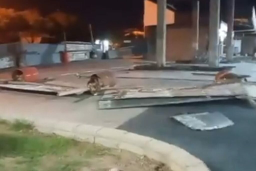 Unas horas antes, en la estación de Servicio de Avenida Centenario y Víctor Tula el viento tumbó unas chapas que delimitan una obra en construcción.